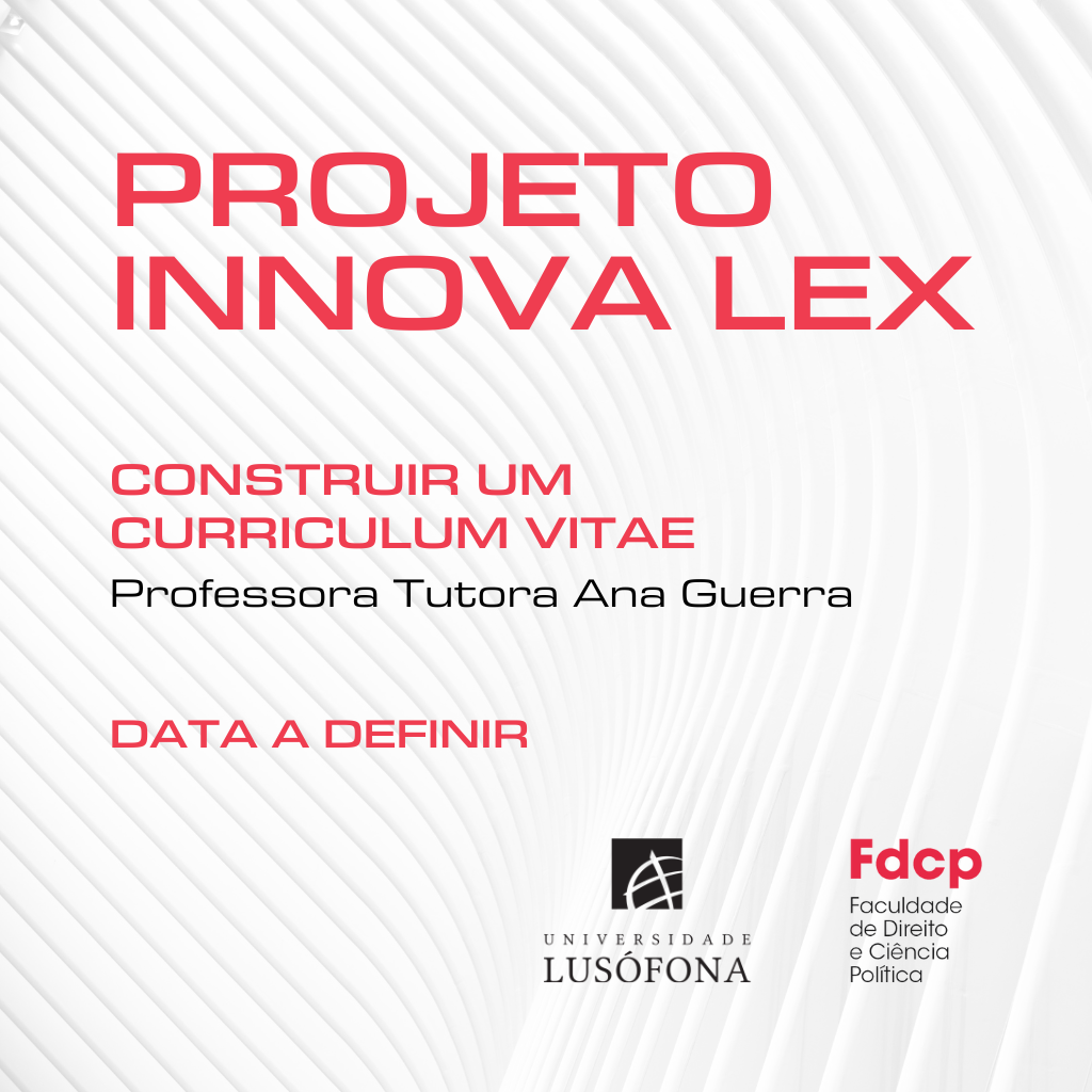 O programa InovaLex, com o objetivo de dar aos Estudantes um conjunto de ferramentas fundamentais para o seu sucesso académico e profissional, encontra-se a organizar uma sessão sobre Construir um Curriculum Vitae.