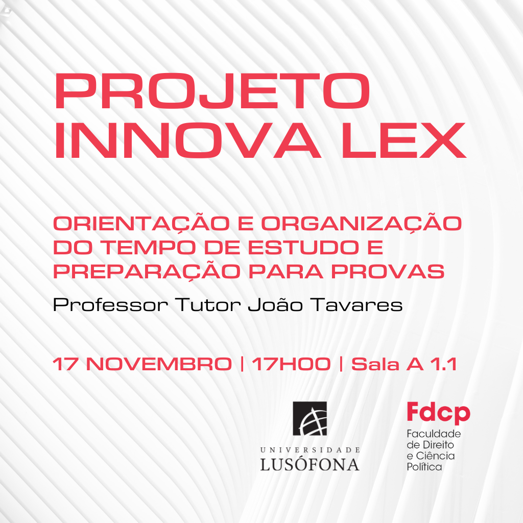 O programa InovaLex, com o objetivo de dar aos Estudantes um conjunto de ferramentas fundamentais para o seu sucesso académico e profissional, encontra-se a organizar uma sessão sobre Orientação e organização do tempo de estudo e preparação para provas.