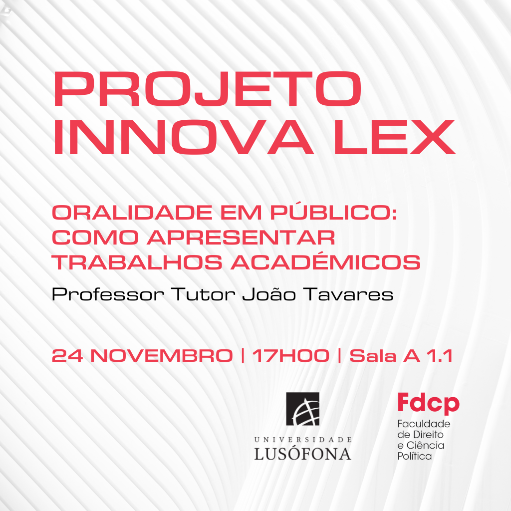 O programa InovaLex, com o objetivo de proporcionar aos Estudantes ferramentas essenciais para o seu sucesso académico e profissional, encontra-se a organizar uma sessão sobre Oralidade em Público: como apresentar trabalhos académicos.