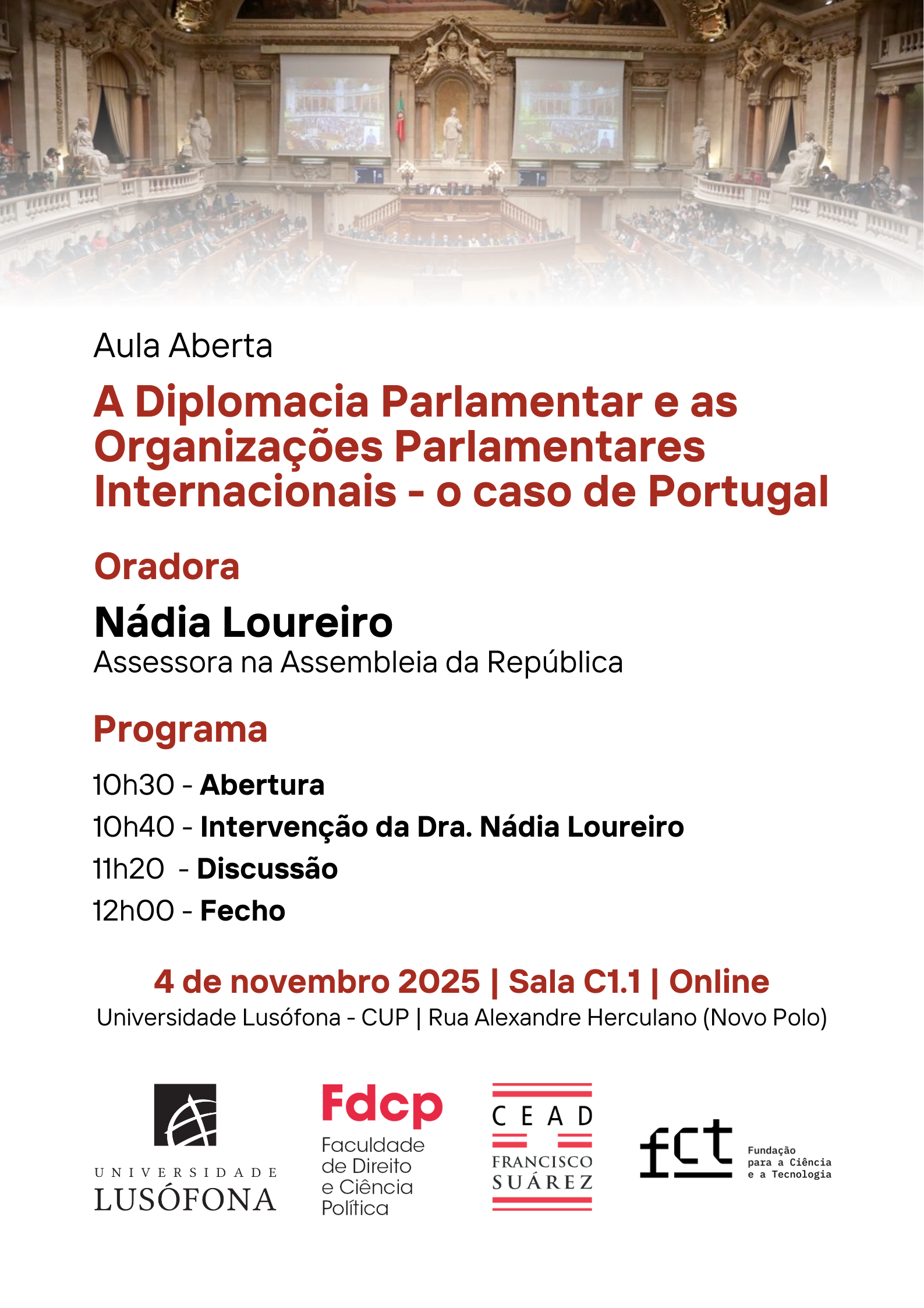 Convidamos toda a comunidade académica e o público em geral para a Aula Aberta "A diplomacia parlamentar e as organizações parlamentares internacionais - o caso de Portugal", a realizar-se no dia 4 de novembro de 2025, pelas 10h30, na Sala C1.1 da Universidade Lusófona – CUP, situada na Rua Alexandre Herculano (Novo Pólo).