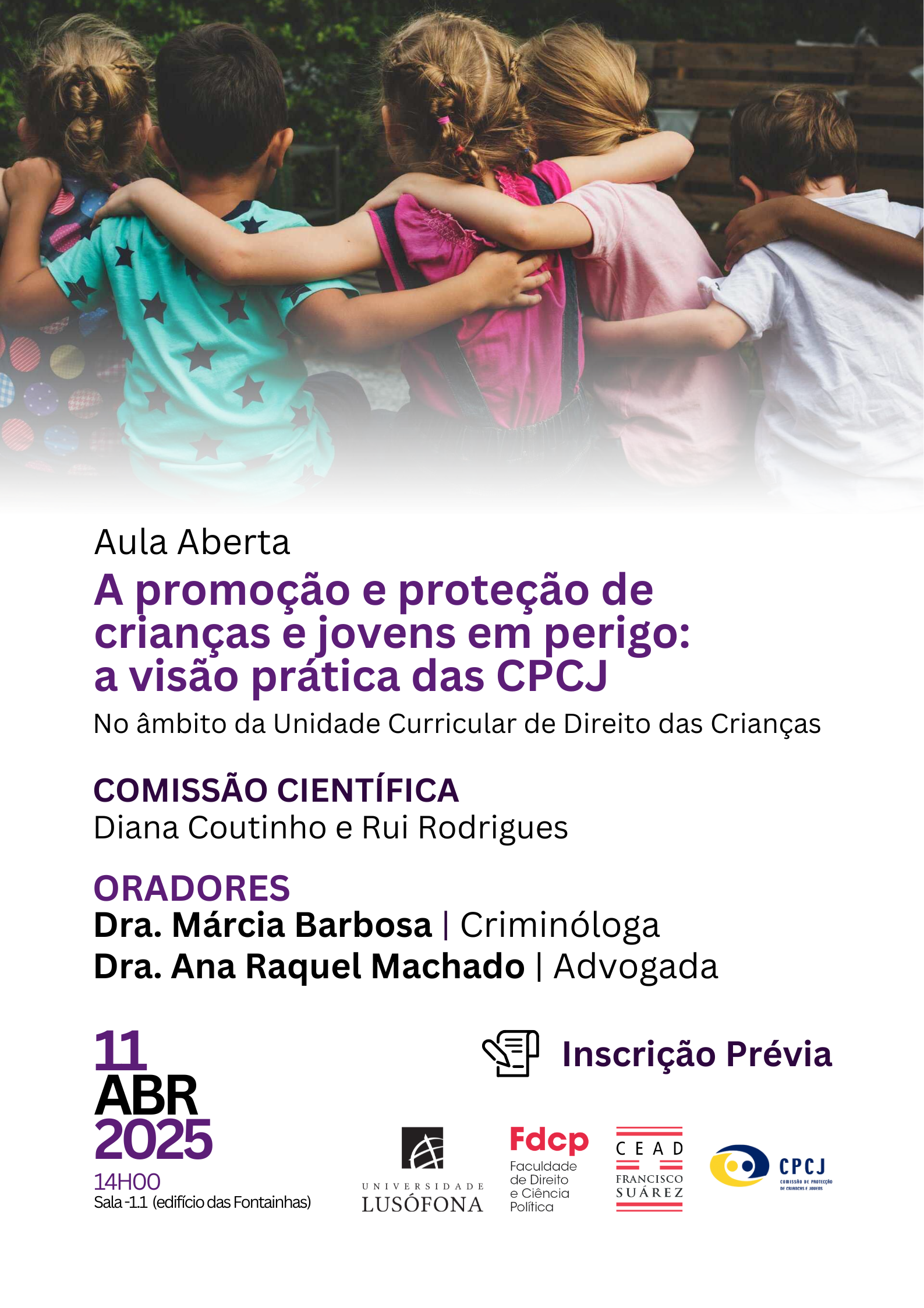 Divulgamos e convidamos toda a comunidade científica e académica a participar na aula aberta subordinada ao tema "A promoção e proteção de crianças e jovens em perigo: a visão prática das CPCJ", que se realizará no próximo dia 11 de abril, pelas 14h na sala C -1.1, na Universidade Lusófona - Centro Universitário do Porto.