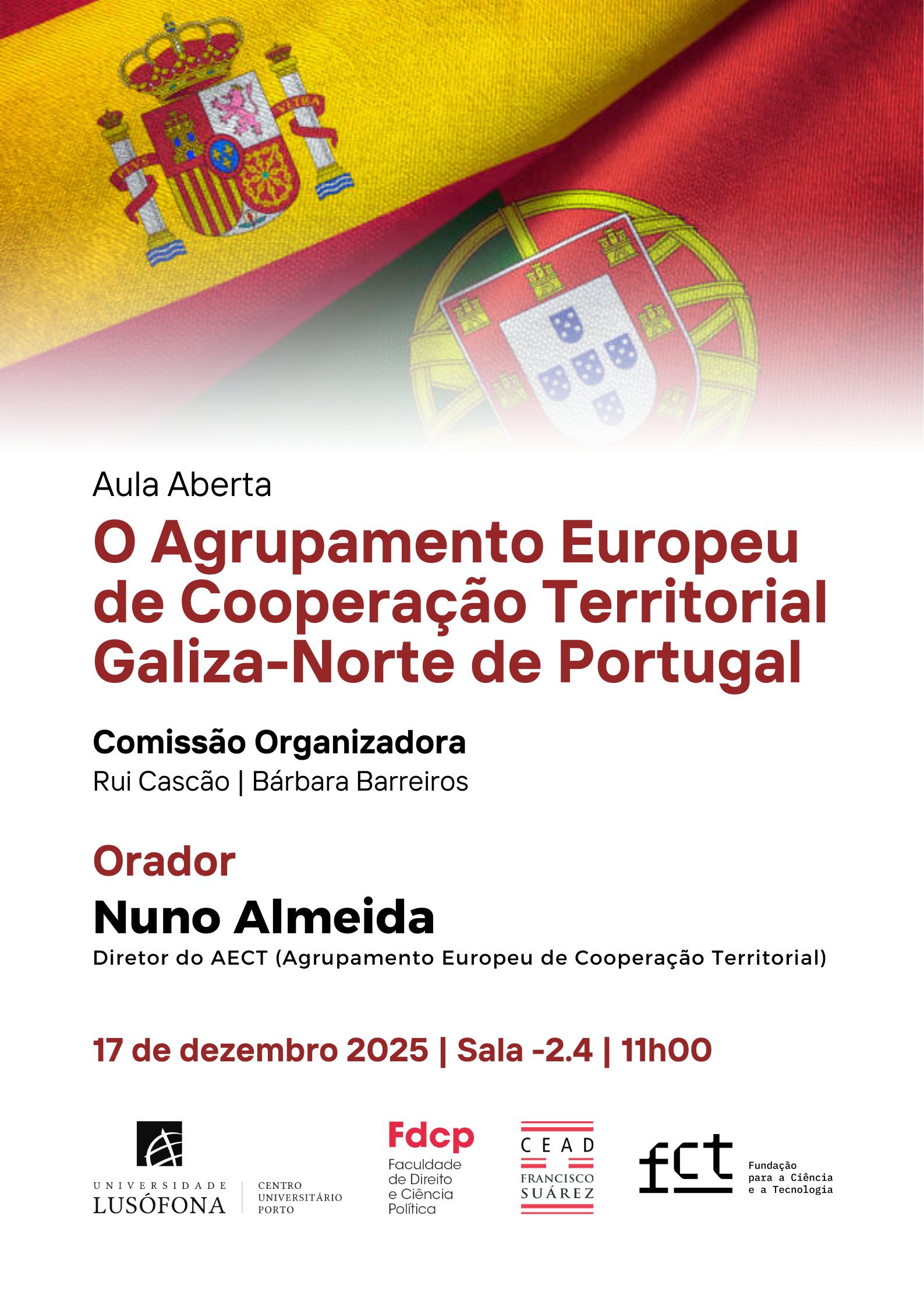A Faculdade de Direito e Ciência Política irá acolher, no próximo dia 17 de dezembro, uma Aula Aberta dedicada ao tema “O Agrupamento Europeu de Cooperação Territorial (AECT) Galiza–Norte de Portugal”. A sessão decorrerá na Sala -2.4, com início às 11h00.