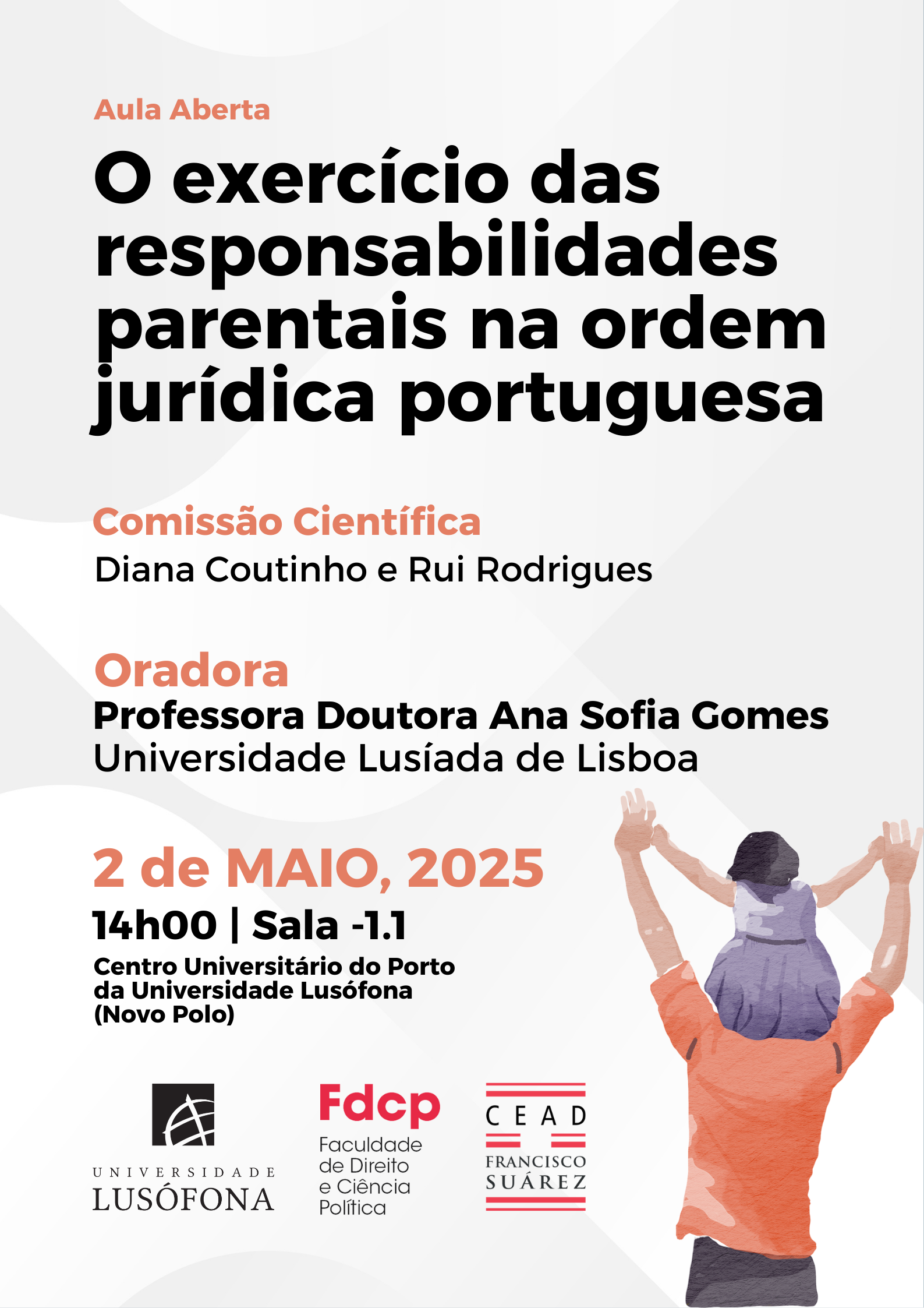 Convidamos toda a comunidade académica e interessados para a Aula Aberta com o tema "O exercício das responsabilidades parentais na ordem jurídica portuguesa", que terá lugar no próximo dia 2 de maio às 14h00, na Sala -1.1 do Centro Universitário do Porto da Universidade Lusófona (Novo Polo).