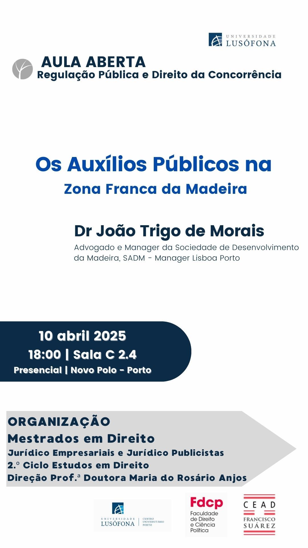 Convida-se toda a comunidade académica a participar na Aula Aberta - "Os Auxílios Públicos na Zona Franca da Madeira", integrada nas UC´s Regulação Pública e Direito da Concorrência, dos Mestrados em Direito - Jurídico Empresariais e Jurídico Publicistas - que se realizará no próximo 10 de abril de 2025, às 18h, Sala C 2.4 – Porto.