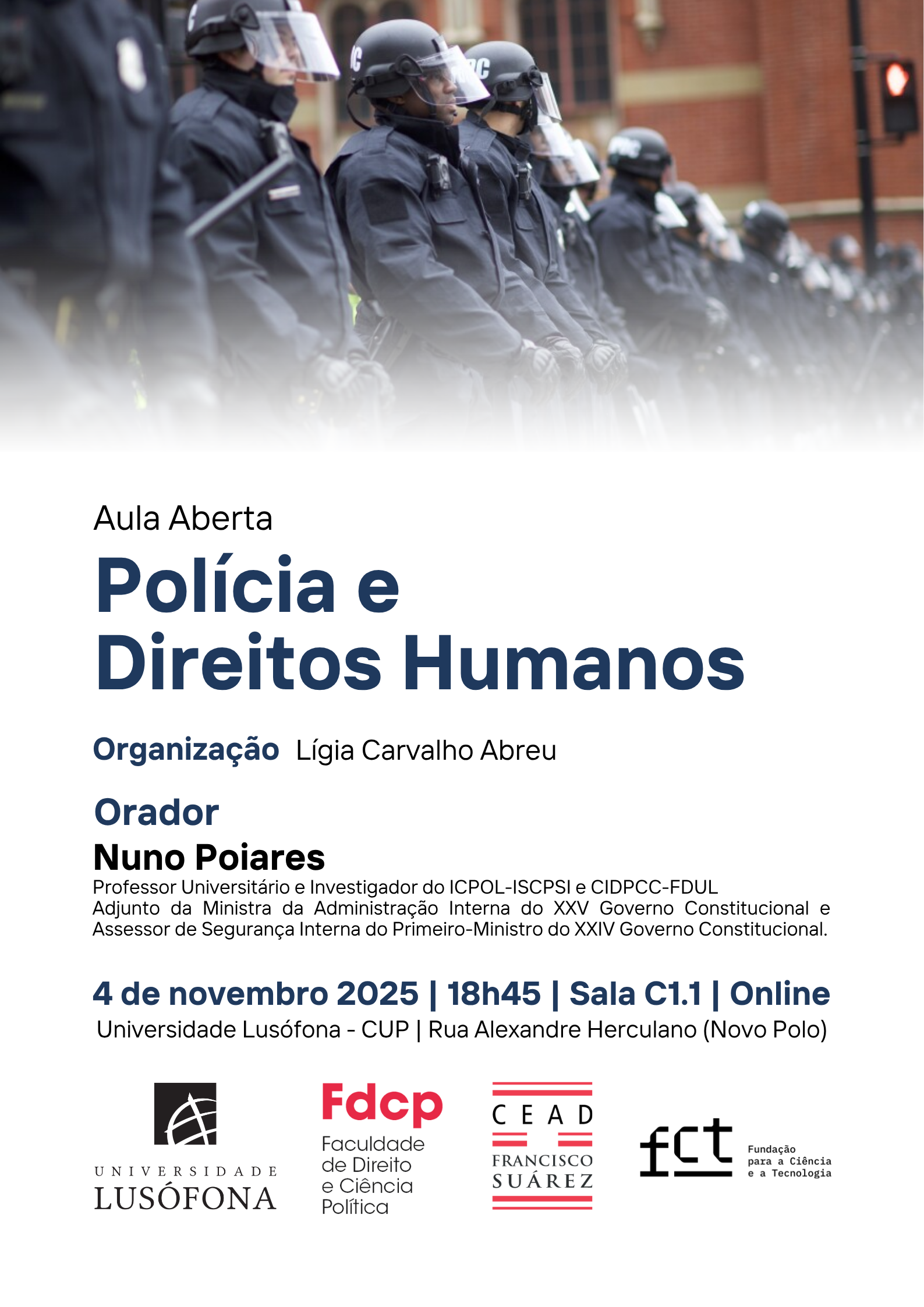 O CEAD Francisco Suárez convida toda a comunidade académica e o público em geral para a Aula Aberta "Polícia e Direitos Humanos", a realizar-se no dia 4 de novembro de 2025, pelas 18h45, na Sala C1.1 da Universidade Lusófona – CUP, situada na Rua Alexandre Herculano (Novo Pólo).