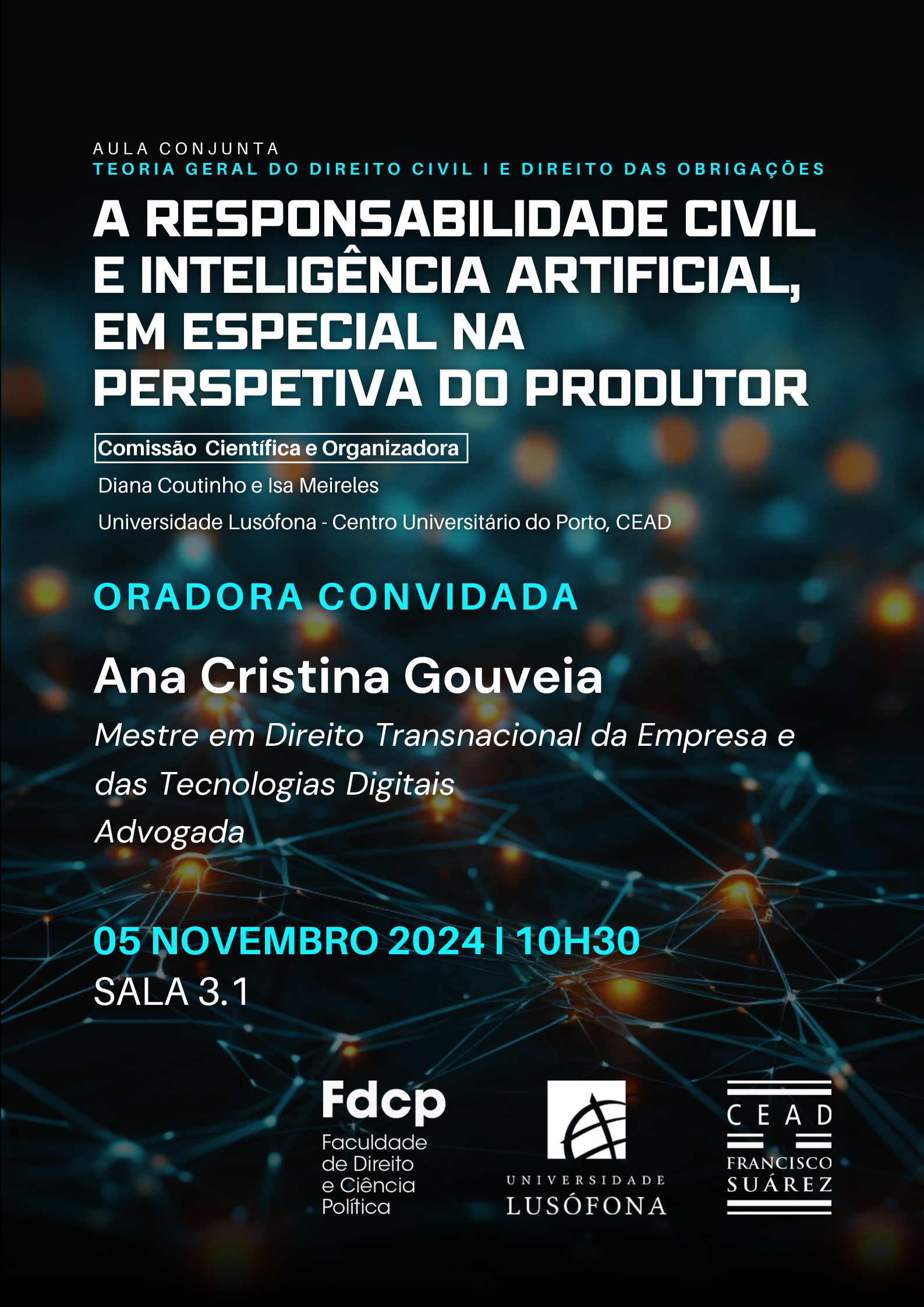 Convidamos toda a comunidade académica a assistir à Aula Conjunta Teoria Geral do Direito Civil I e Direito das Obrigações subordinada ao tema "A Responsabilidade Civil e Inteligência Artificial" com participação de Ana Cristina Gouveia, Mestre em Direito Transnacional da Empresa e das Tecnologias Digitais e Advogada.
