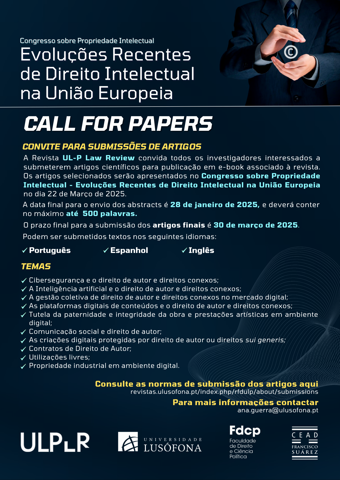 A UL-P Law Review convida todos os investigadores interessados a submeterem artigos científicos para publicação em e-book associado à Revista. Os artigos selecionados serão apresentados no Congresso sobre Propriedade Intelectual - Evoluções Recentes de Direito Intelectual na União Europeia no dia 22 de Março de 2025, na Universidade Lusófona - Centro Universitário do Porto.