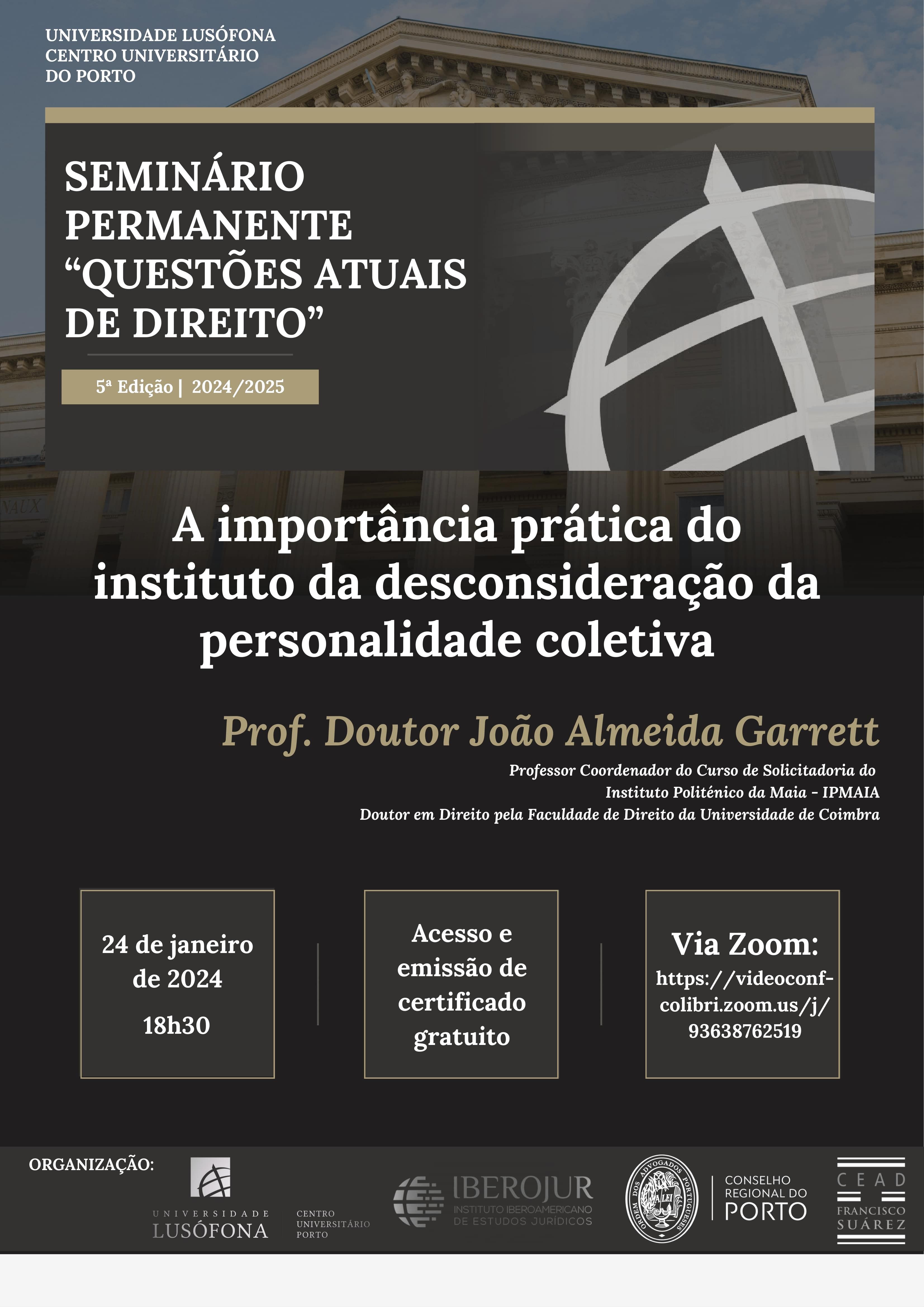 Convidamos toda a comunidade académica e científica para assistir ao 3º Seminário da 5ª Edição do Seminário Questões Atuais de Direito, que se realizará no próximo 24 de janeiro de 2025, sob a temática: "A importância prática do instituto da desconsideração da personalidade coletiva"