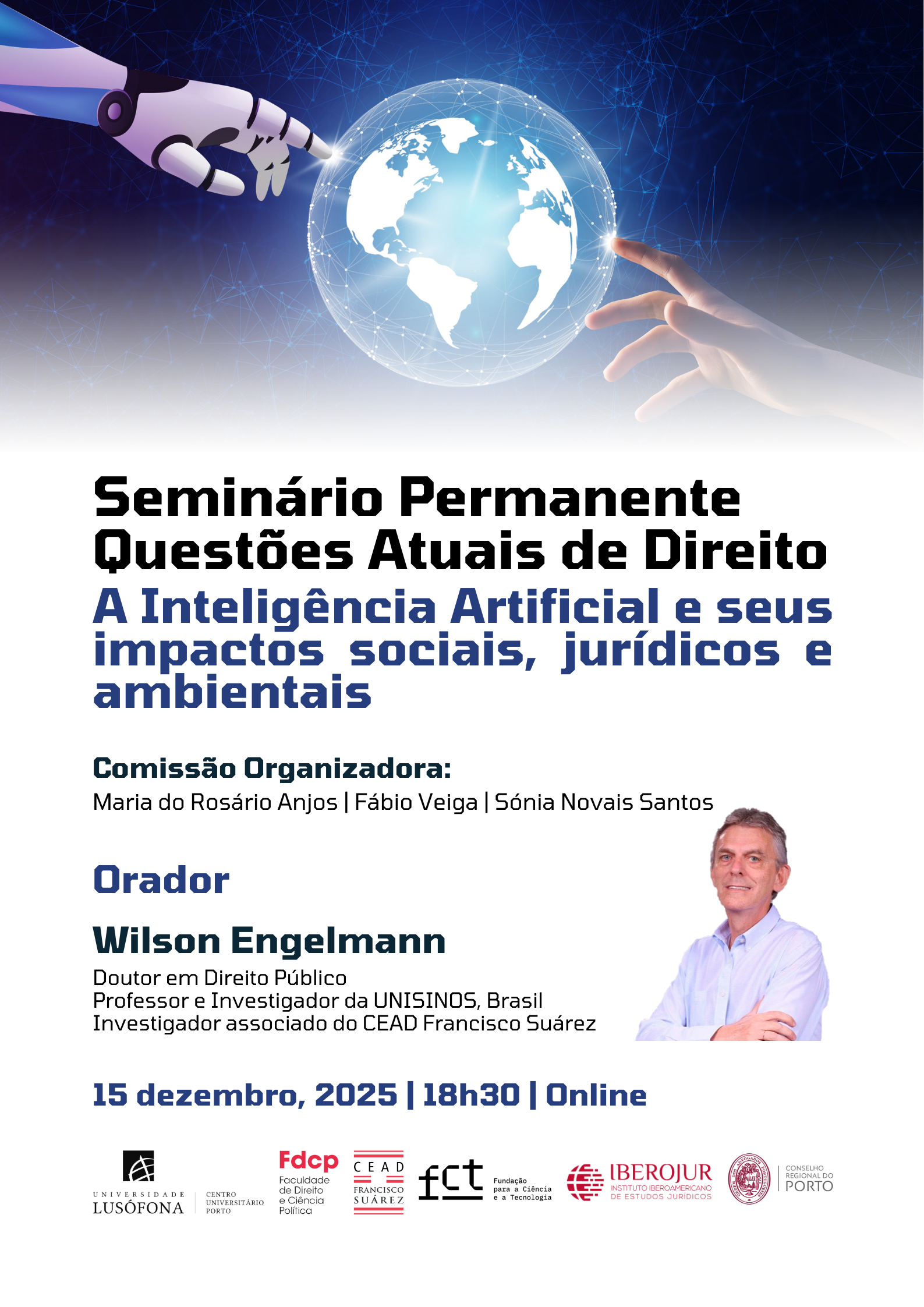 O encontro contará com a participação do Professor Wilson Engelmann, reconhecido especialista na área, Doutor e Mestre em Direito Público; Professor e Investigador do Programa de Pós-Graduação em Direito – Mestrado e Doutorado e do Mestrado Profissional em Direito da Empresa e dos Negócios da Universidade do Vale do Rio dos Sinos (UNISINOS), Brasil; e Investigador associado do CEAD Francisco Suárez. A sua atuação académica e investigativa aborda, de forma aprofundada, os impactos da tecnologia e da inovação sobre o Direito, sendo referência internacional no tema.