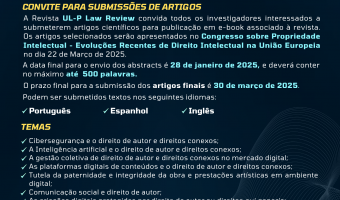 A UL-P Law Review convida todos os investigadores interessados a submeterem artigos científicos para publicação em e-book associado à Revista. Os artigos selecionados serão apresentados no Congresso sobre Propriedade Intelectual - Evoluções Recentes de Direito Intelectual na União Europeia no dia 22 de Março de 2025, na Universidade Lusófona - Centro Universitário do Porto.